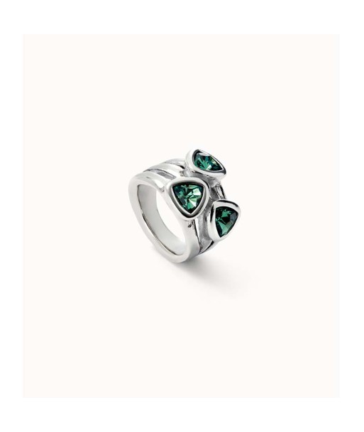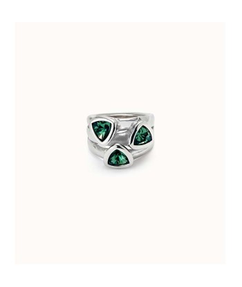 Precioso brazalete con detalle de cuero que hace de cierre y pieza central triangular con un cristal de intenso color verde esmeralda, realizado en metal bañado en plata, grabado el logo de 1 de 50