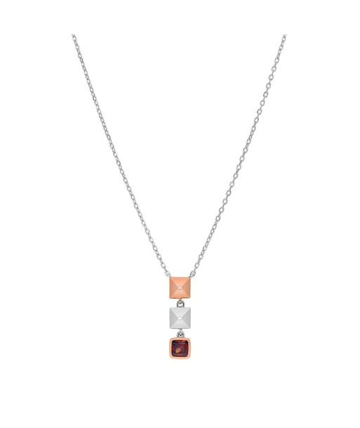 Vanguardistas pendientes largos bicolor en rosa, formados por dos piezas cuadradas facetadas para realzar su brillo y finalizando con una circonita ámbar oscura, unidas por anillas para otorgarle movimiento