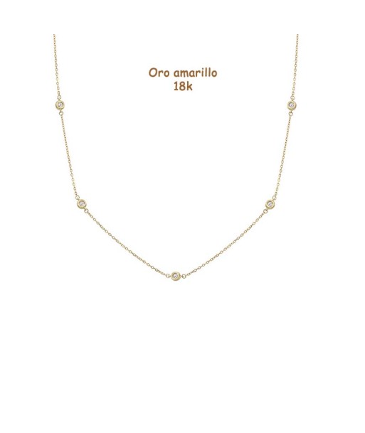 Fina gargantilla en oro de 18k de cadena de 0,5mm con 5 chatones de 2,5mm. Grabado con su debido sello de contraste de fabricación de oro de 1ª Ley.