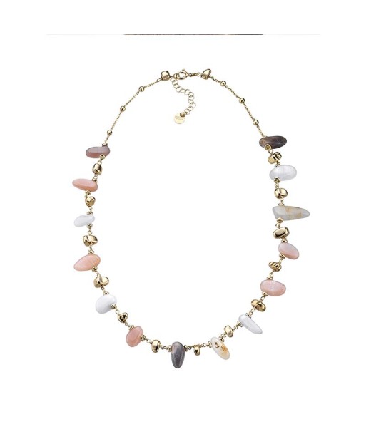 Una pulsera formada por piedras luna asimétricas y pulidas de varios colores con tonos suaves de Durán Exquse y pepitas de plata con baño de oro