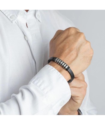 Forma: cuero trenzado negra con piezas acero brillo y en el centro lleva una barra de acero corrugado color negro