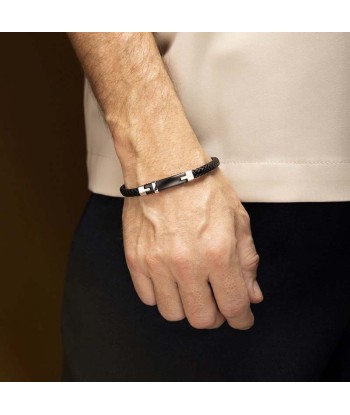 Forma: cuero negro con parte trenzada, centro espigado pulido y piezas en acero brillo, separadores en silicona.