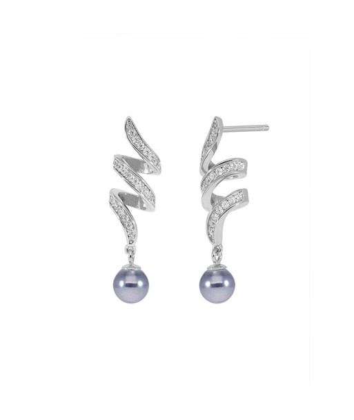 Pendientes largos en forma de tirabuzón con perla gris colgando.