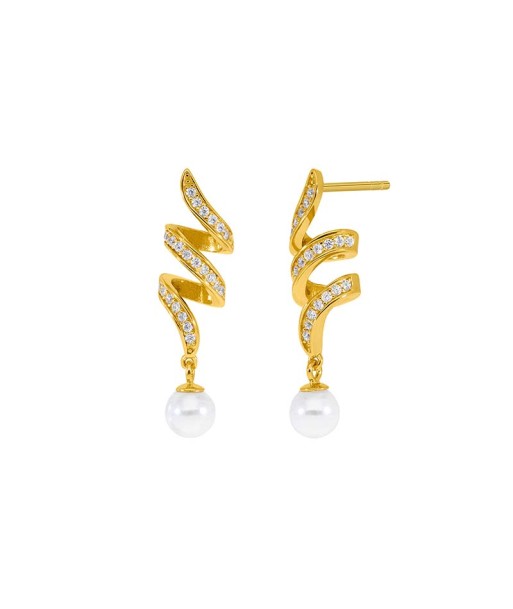 Pendientes largos en forma de tirabuzón con perla blanca colgando.