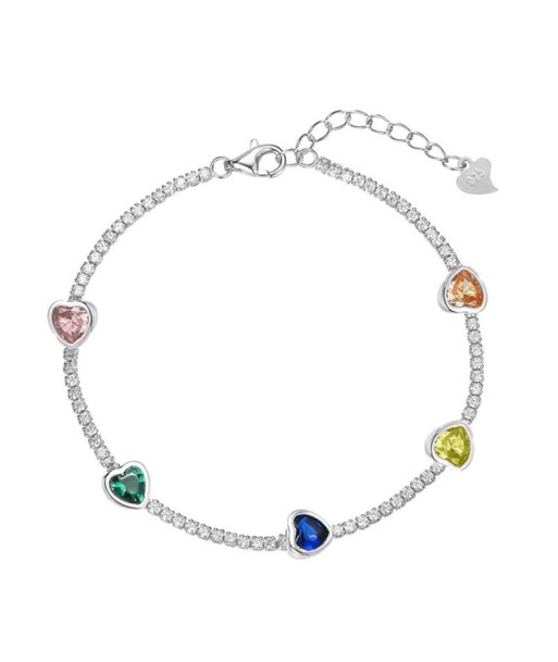 Preciosa pulsera cuajada de circonitas estilo riviere con 5 corazones multicolor