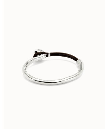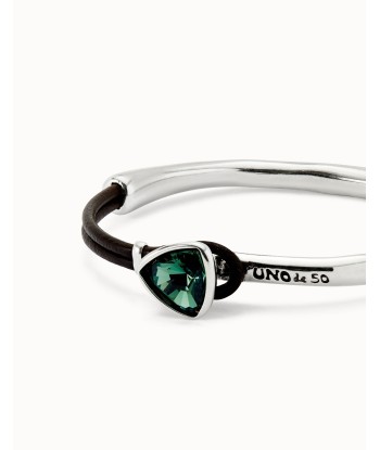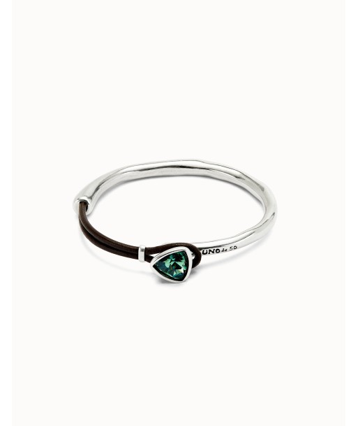 Precioso brazalete con detalle de cuero que hace de cierre y pieza central triangular con un cristal de intenso color verde esmeralda, realizado en metal bañado en plata, grabado el logo de 1 de 50