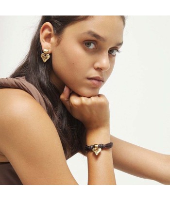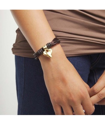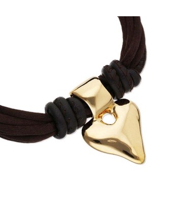 De la colección PALPITO de Unode50. Original pulsera combinando cuero con cordón de seda marrón con un gran corazón central con volumen y suaves ondulaciones, bañado en oro así como su terminal y cadena ajustadora