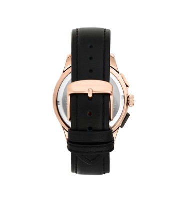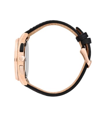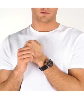 Reloj clásico para caballero , caja muy plana, con detalles en oro rosa en sus índices y agujas, destacando sobre fondo negro