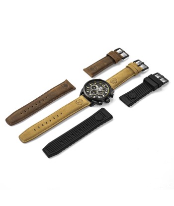 Reloj con caja de 46 mm con acabado negro, función dual time y set de tres correas intercambiables: silicona negra y dos de piel en tonos marrón tostado y marrón. Henniker Mark III es una edición especial que celebra una década de la marca