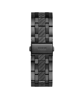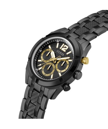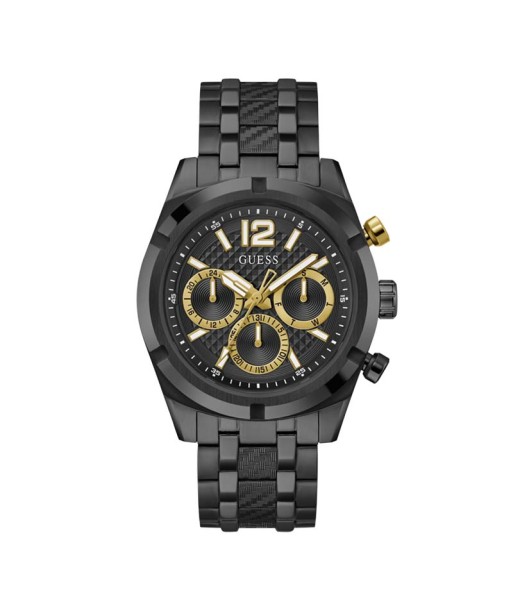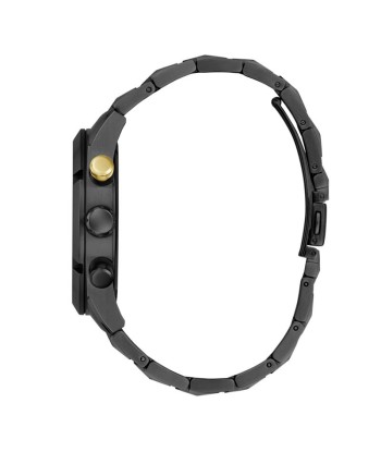 Reloj robusto con caja y brazalete en acero negro resaltando en su esfera negra detalles en dorado.