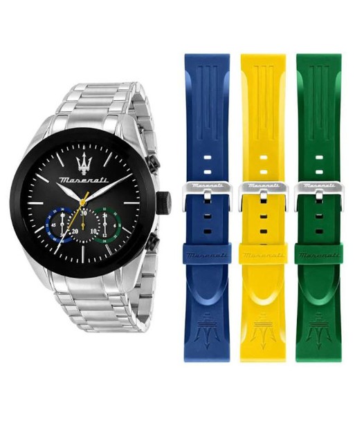 Reloj Maserati para hombre, ref.R8873612061 de la colección TRAGUARDO, edición especial en estuche con tres correas de silicona de repuesto, azul, amarilla y verde , esfera y bisel negro , contrastando con índices y agujas en blanco, y tres esferitas con los tres colores de las pulseras.