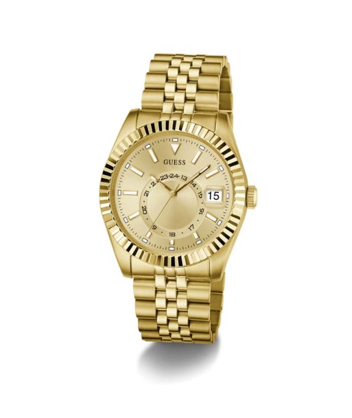 Reloj Guess dorado para caballero , esfera color champan , con ventana de calendario lupa, índices y agujas luminiscentes (brillan en la oscuridad)