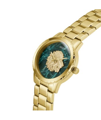 Reloj Guess dorado para caballero , original esfera con un elegante acabado efecto mármol color verde, con la cara de un león de perfil