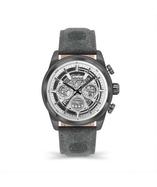 Reloj de acero y piel para hombre de la marca Timberland. Caja plateada y bisel negro numerado, detalles mecánicos la esfera negra destacando sus índices y agujas en dorado, con correa de piel verde khaki y también con el icónico árbol de la marca grabado, fiel a su ADN con los mejores materiales y respetando el medio ambiente, incluso en su reciclada caja de presentación