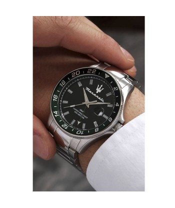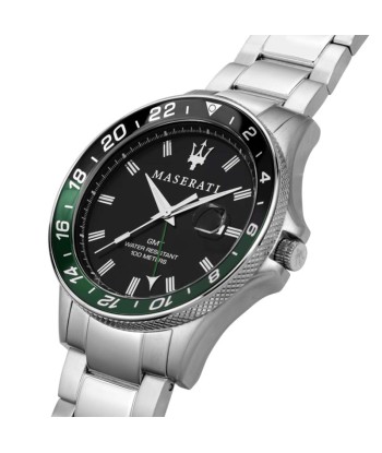 Reloj Maserati para hombre, ref.R8853140005 de la colección SFIDA , de acero con una esfera negra que contrasta con parte del bisel en verde y numeración blanca.