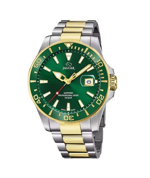 Elegante reloj Oriente con caja de acero inoxidable y color dorado, una esfera verde intenso resaltando los indices y agujas en dorado
