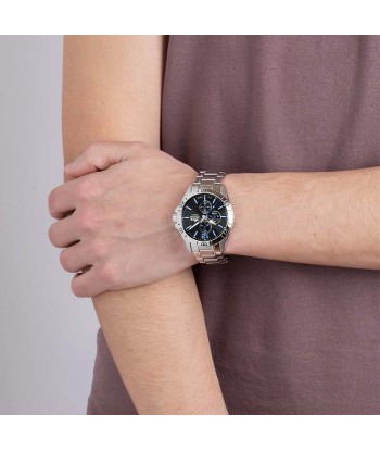 Para los amantes de la relojería hecha en Suiza, este reloj para caballero todo en acero, cristal zafiro anti reflejos con un original fondo de esfera azul de cuadraditos y un bisel matizado y facetado en 8 tramos contrastando con el brillo en sus caras