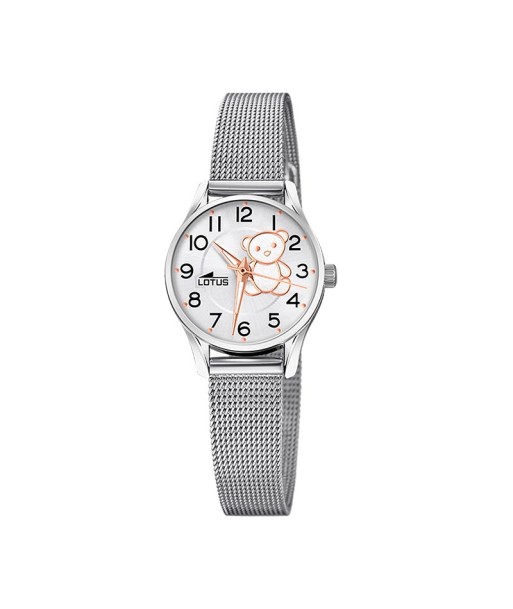 Precioso reloj para el día de su comunión, con correa malla de acero y un detalle de osito en su esfera, detalles en rosé