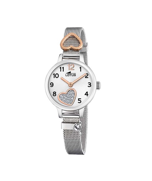 Precioso reloj para el día de su comunión, con una flor blanca esmaltada en su bisel y una original pulsera de piel troquelada de flores plateadas