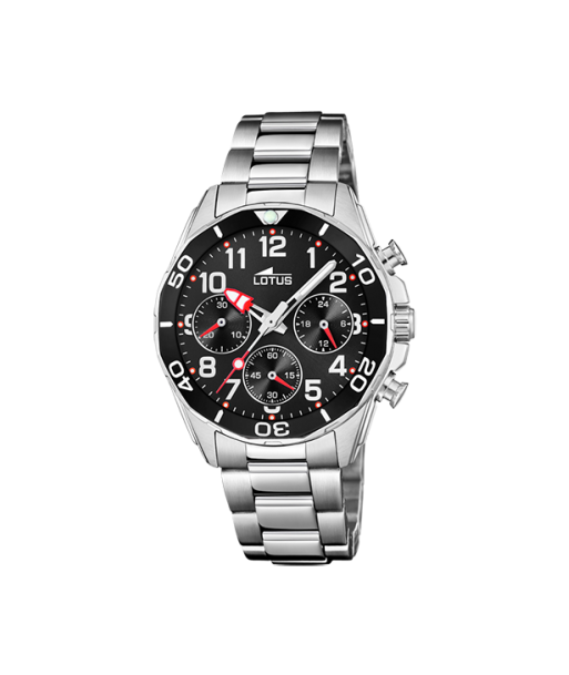 Cronógrafo para cadete, en negro con detalles en rojo y numeración en el bisel