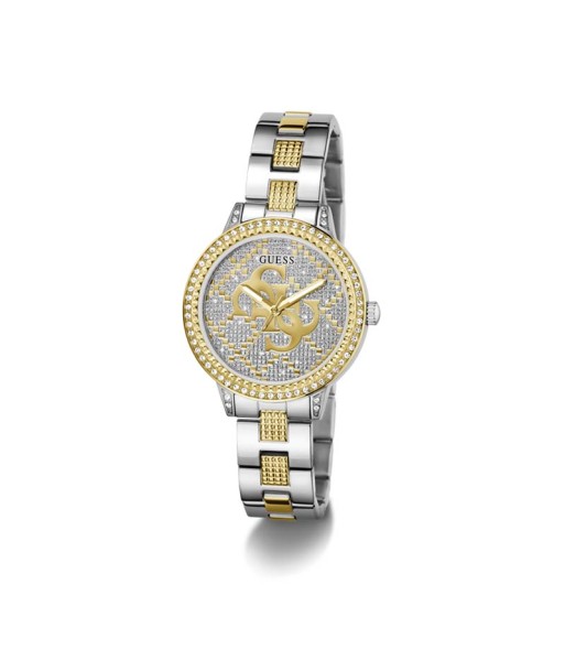 Reloj Guess con caja de acero y detalles dorados , esfera con logotipo G4 y detalles brillantes, brazalete con eslabones centrales tachonados.