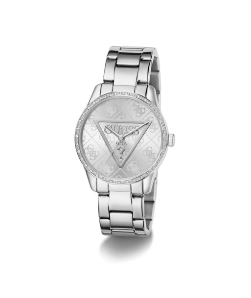 Reloj Guess todo de acero , esfera con logotipo 4G con superposición del logotipo del icónico triángulo y cristales transparentes alrededor de su bisel