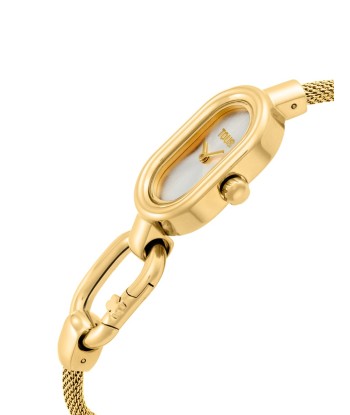 Reloj para mujer con elegante caja ovalada, todo en acero con una esfera clara y sencilla con índices y agujas doradas que destacan en su fondo nacarado rosa