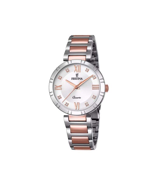 Precioso reloj para mujer con esfera plateada resaltando las tres agujas en bronce e índices con circonitas
