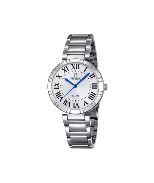 Esfera plateada blanca nacarada, resaltando su numeración romana en negro y agujas en azul