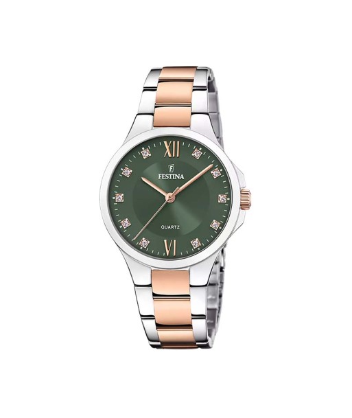 Todo acero, con detalles IP rosé, contrastando con su fondo de esfera verde oscuro