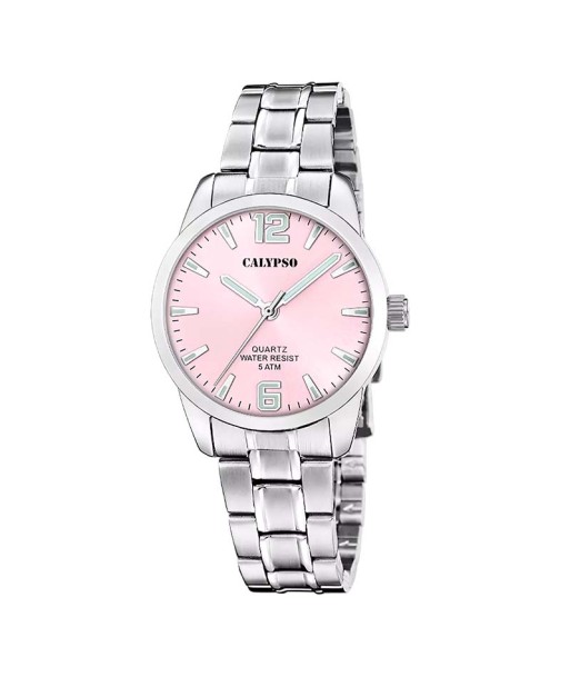 Agujas e índices luminiscentes, resaltando sobre un fondo de esfera rosa claro