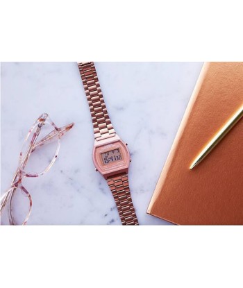 Elegante reloj para mujer con índices romanos dorados resaltando entre el fondo negro con grabado
