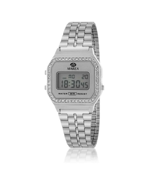 - Reloj juvenil para mujer, digital rectangular con pantalla LCD. Bisel con circonitas blancas, esfera gris