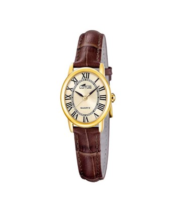 Reloj para mujer con elegante caja ovalada, con pulsera de piel marrón y caja en acero IP dorada, con una esfera clara y sencilla con agujas e índices romanos en negro que destacan en su fondo tono champagne